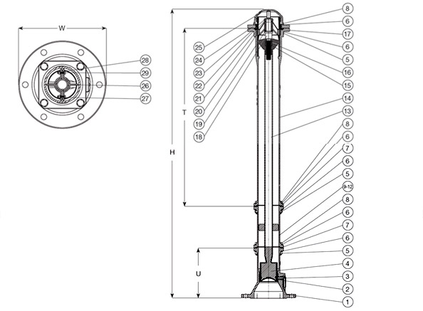 Перечень компонентов: 1. Камера седла 2. Седло 3. Дренажная труба 4. Затвор 5. Гайка M16 6. Шайба 7. Плоская прокладка 8. Болт 9. Удлинение 1000 мм 10. Удлинение 750 мм 11. Удлинение 500 мм 12. Удлинение 250 мм 13. Стержень шпинделя 14. Верхняя часть корпуса 15. Гнездо гайки шпинделя 16. Гайка шпинделя 17. Герметизирующее кольцо 18. Шпиндель 19. Шайба 20. Направляющая шпинделя 21. Шпилька фиксирующее 22. Резьбовой ниппель 23. Кольцо фиксирующее 24. Верхний фланец 25. Колпак 26. Подшипник шпинделя 27. Болт M6 x 25 28. Гайка 29. Шайба |