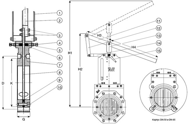 Компоненты:1. Стойка 6. Коробка уплотнения 11. Рычаг2. Шток 7. Корпус 12. Guide3. Болт и гайка 8. Шибер 13. Коромысло4. Болт коробки уплотнения 9. Прокладка на корпус 14. Кронштейн рычага5. Толкатель 10. Болт на корпус 15. Блокирующая рукоятка