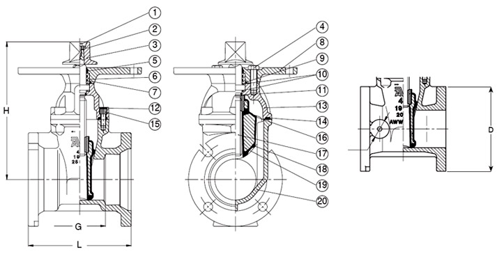 1. Шестигранный болт 8. Фланец для индикатора 15. Болты крышки2. Шайба 9. Кольцо на фланец для индикатора 16. Клиновая гайка3. Гайка под ключ 10. Антифрикционные шайбы 17. Шток4. Сальниковые болты 11. Нижнее кольцо штока 18. Покрытие клина5. Грязесъемное кольцо 12. Уплотнения болтов крышки 19. Клин6. Коробка уплотнения штока 13. Крышка задвижки 20. Корпус задвижки7. Верхние штоковые кольца 14. Прокладка крышки