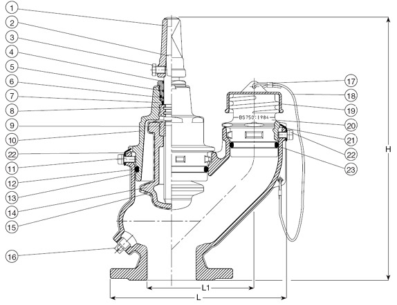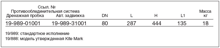 Перечень компонентов: 1. Насадка штока 13. Корпус 2. Шток 14. Фиксированный клапан 3. Болт 15. Вулканизированная резина 4. Кольцо сечения “О” 16. Дренажная пробка 5. Уплотнение штока 17. Втулка обжимная 6. Кольцо сечения “О” 18. Тросик 7. Кольцо сечения “О” 19. Пылезащитная крышка 8. Упорное кольцо 20. Выходной штуцер 9. Гайка фиксированного штока 21. Предохранительное устройство 10. Крышка корпуса 22. Винт с цилиндр. головкой 11. Винт с цилиндр. головкой 23. Кольцо сечения “О” 12. Кольцо сечения “О” Ссыл. No Противооблединительная система Масса Дренажная пробка Авт. задвижка DN L H L1 кг 19-989-01001 19-989-31001 80 287 444 135 18 19/989: