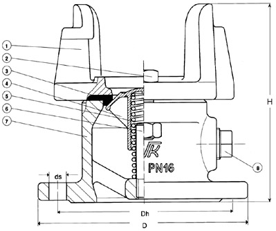 Материалы: Корпус и Серый чугун GG-25 по DIN 1691 байонетное по BS 1452, марка 220/250 соединение Покрытие Порошковое эпоксидное по DIN 30677, внутри и снаружи, нанесенное электростатическим способом Клапан Полиамид 6.6 Седло клапана Резина SBR Пружина Нержавеющая сталь AISI 304 Болт на Сталь 8.8, покрытая цинком байонетное соединение Стержень Латунь CZ 132 устойчивая к направляющий обесцинкованию по BS 2874 Пробка Сталь 8.8 оцинкованная